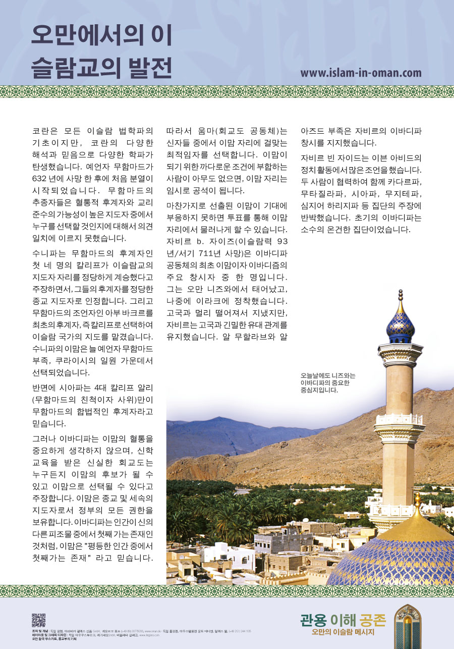 "또 특별히 오만 술탄국의 관용적인 이슬람 이바디 학파의 긍정적인 영향을 크게 강조하고 있다."
